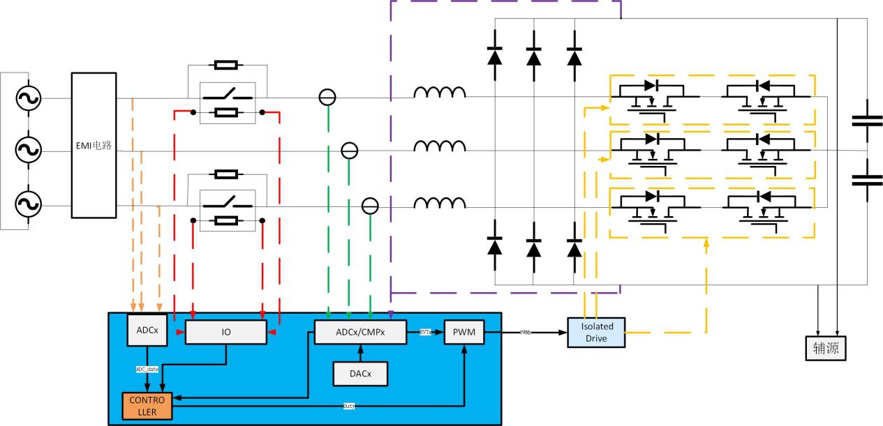 · 采用输出侧取电架构,突破传统Vienna方案单母线取电限制(辅源从输出直流正负母线处一侧取电)。